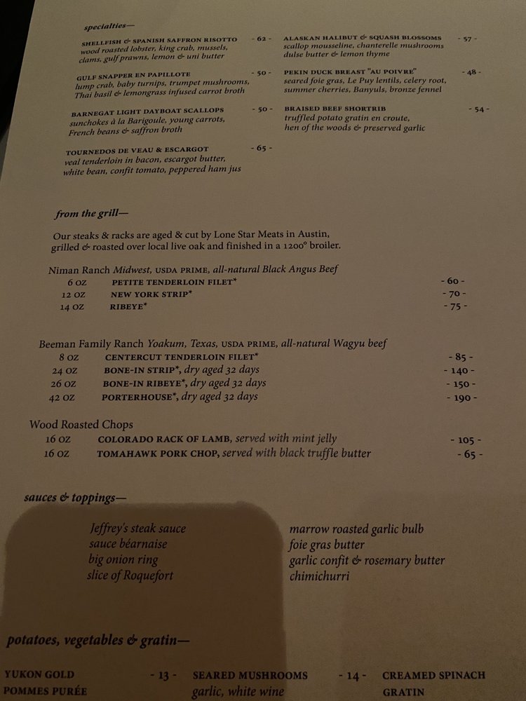 Welcome to Jeffrey's, a premier dining destination in Austin, Texas, known for its upscale and classy atmosphere. Offering a variety of upscale dishes, Jeffrey's take pride in providing exceptional service and a memorable dining experience.