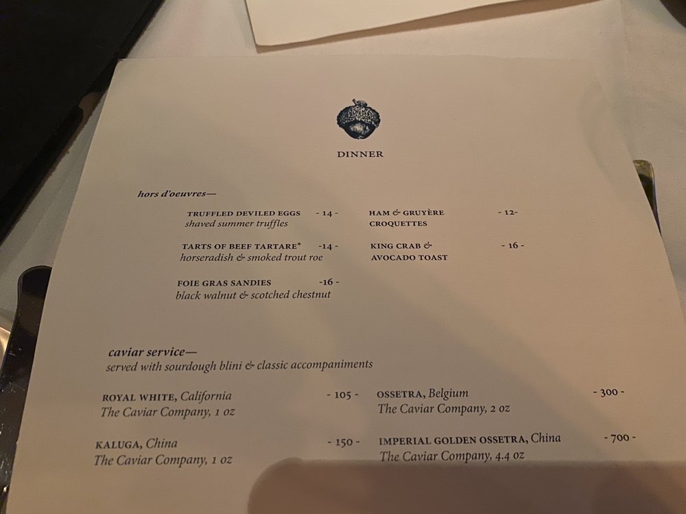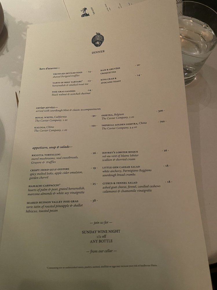 At Jeffrey's, you can indulge in a selection of exquisite hors d'oeuvres like Foie Gras Torchon and Truffled Deviled Eggs, followed by delightful appetizers such as Crispy Fried Gulf Oysters and Wood Oven Roasted Crab Cake. For soup and salad lovers, options like Pure of Cauliflower Soup and Grilled Kale & Baby Romaine Caesar are sure to impress.